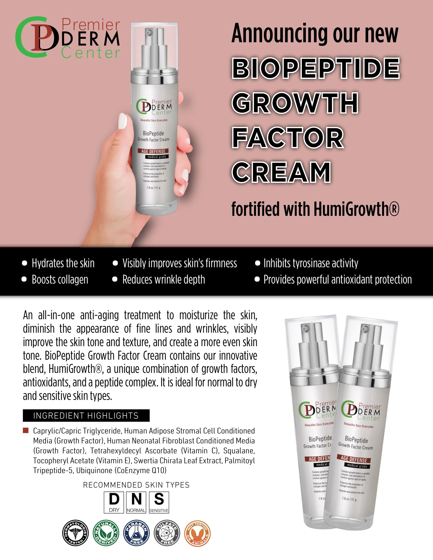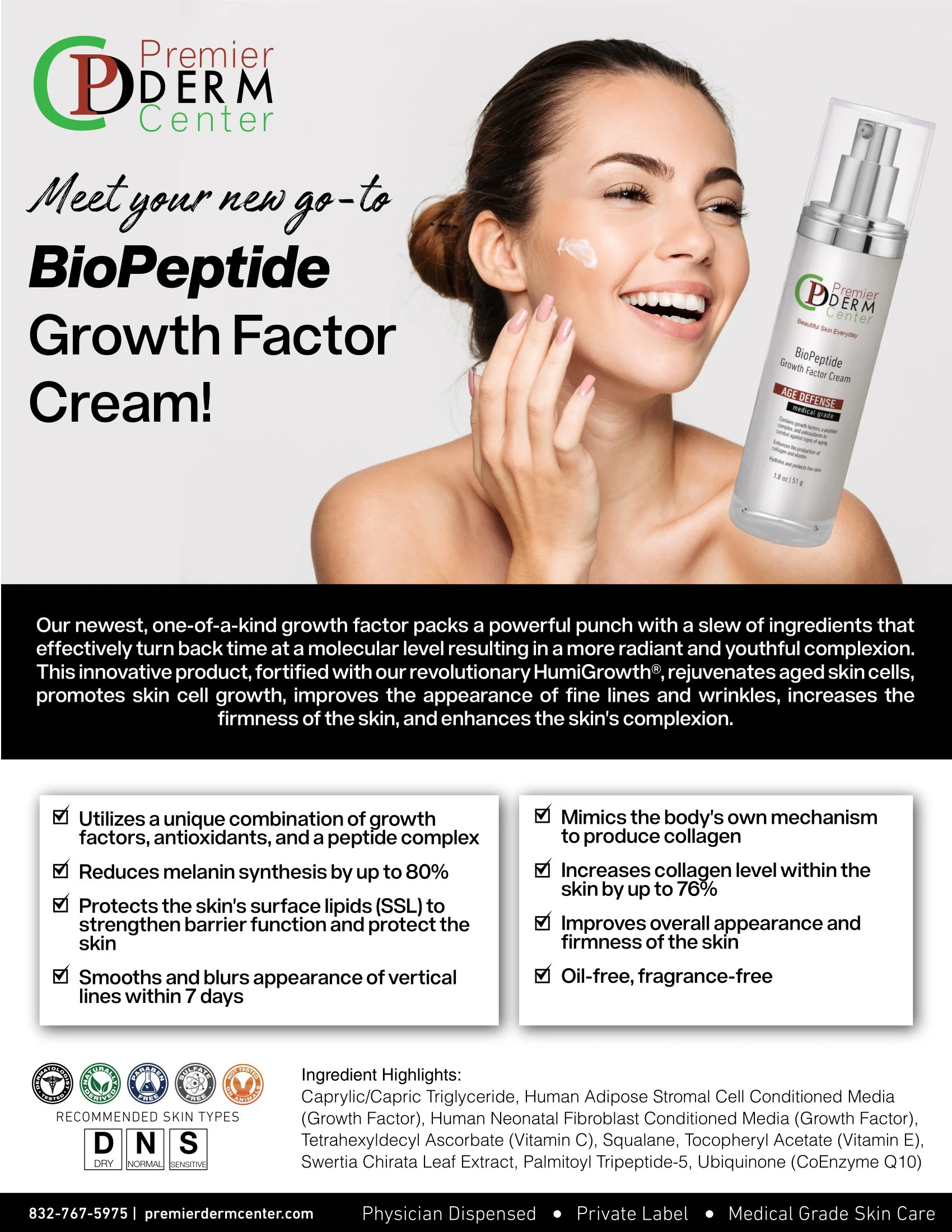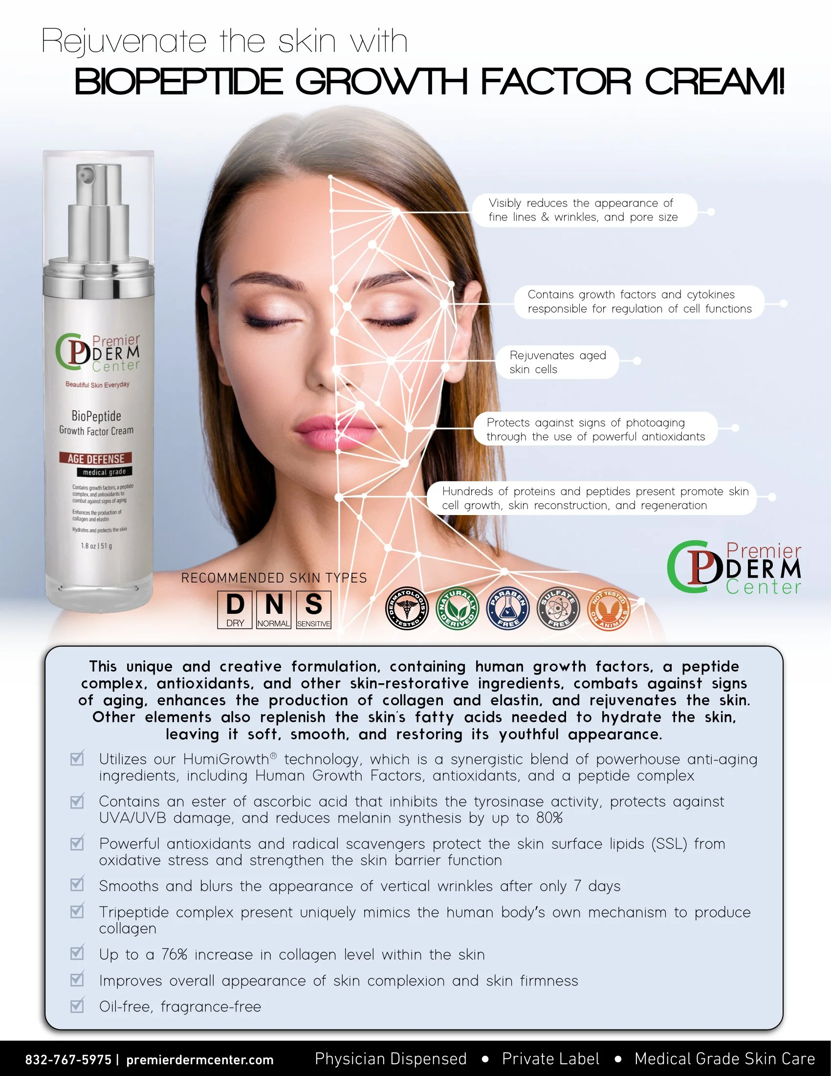 This unique and creative formulation, containing human growth factors, a peptide complex, antioxidants, and other skin-restorative ingredients, combats against signs of aging, enhances the production of collagen and