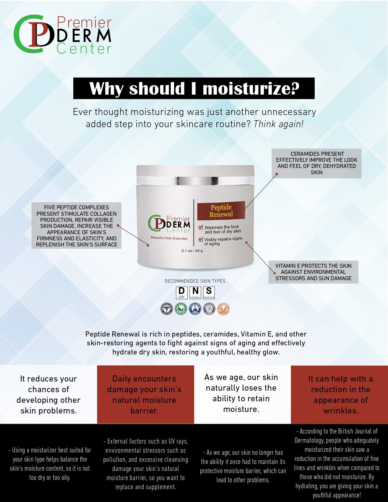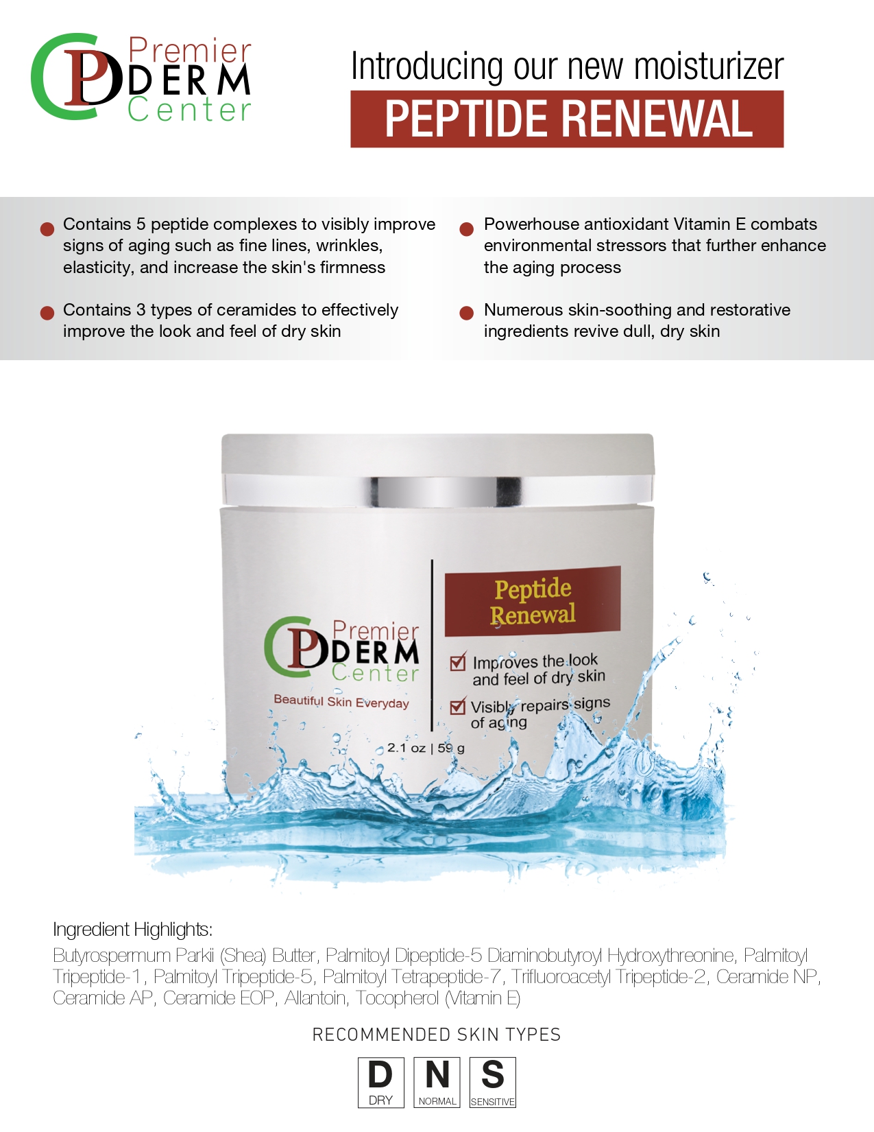 Moisturizer rich in peptides, ceramides, Vitamin E, and other skin-restoring agents formulated to fight against signs of aging and hydrate dry skin, restor- ing a youthful, healthy glow. This innovative moisturizer’s five peptide complexes stimulate collagen production, repair visible skin damage, increase the appearance of skin’s firmness and elasticity, and replenish the skin’s surface to calm visible signs of sensitization. Also, ceramides present e¦ectively improve the look and feel of dry, dehydrated skin, while Vitamin E protects the skin against environmental stressors and sun damage. This versatile product is ideal for use up to twice daily or as needed to restore hydration and fight against signs of aging within the skin.
